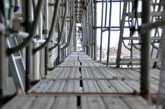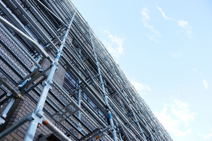 「棚足場」は、チェーンなどによって高所へ吊り下げた枠組みの上に床をつくる工法の足場です。面としての作業スペースを広く確保することができるため、そのぶん作業員の自由度を高められます。
